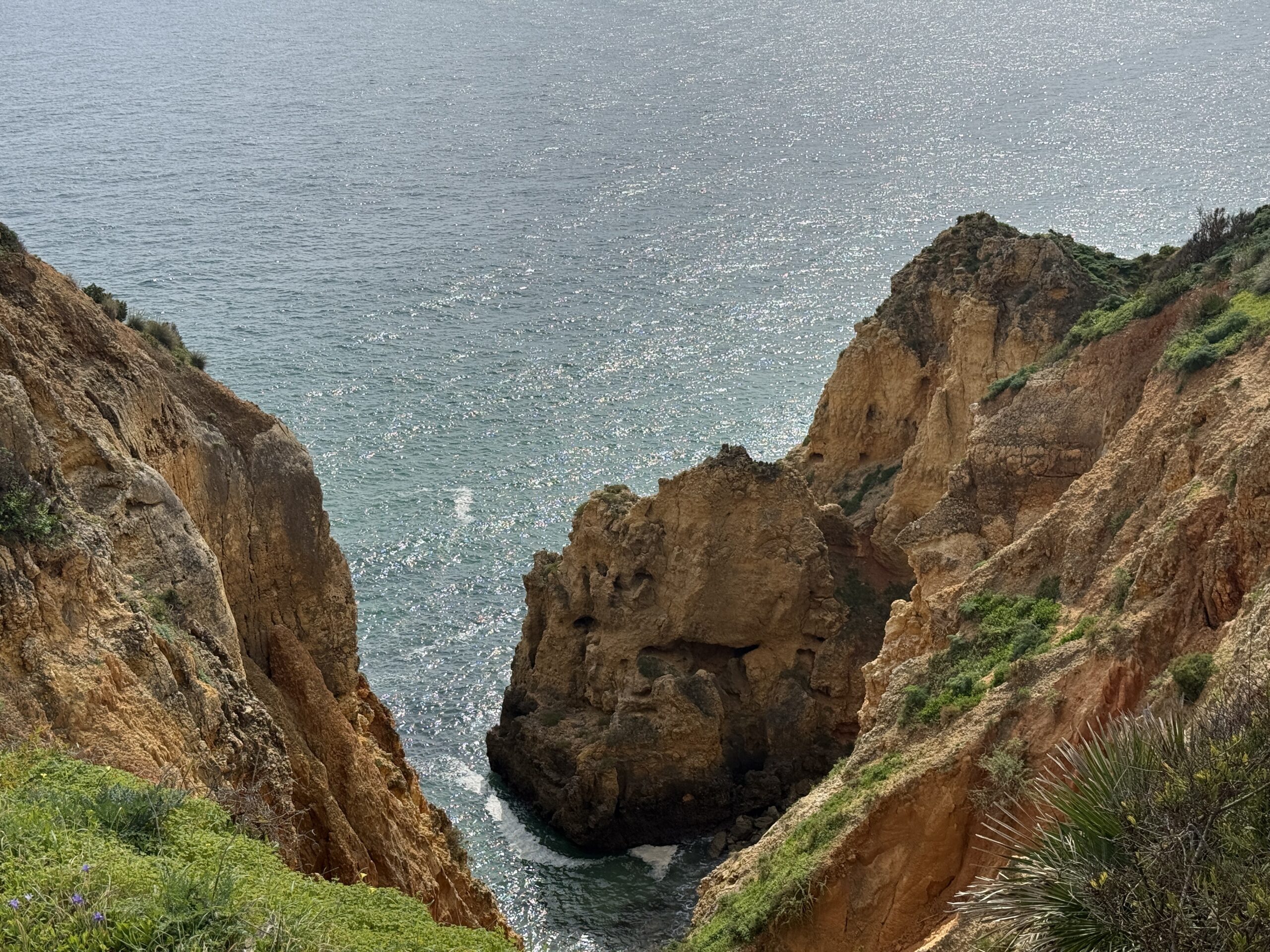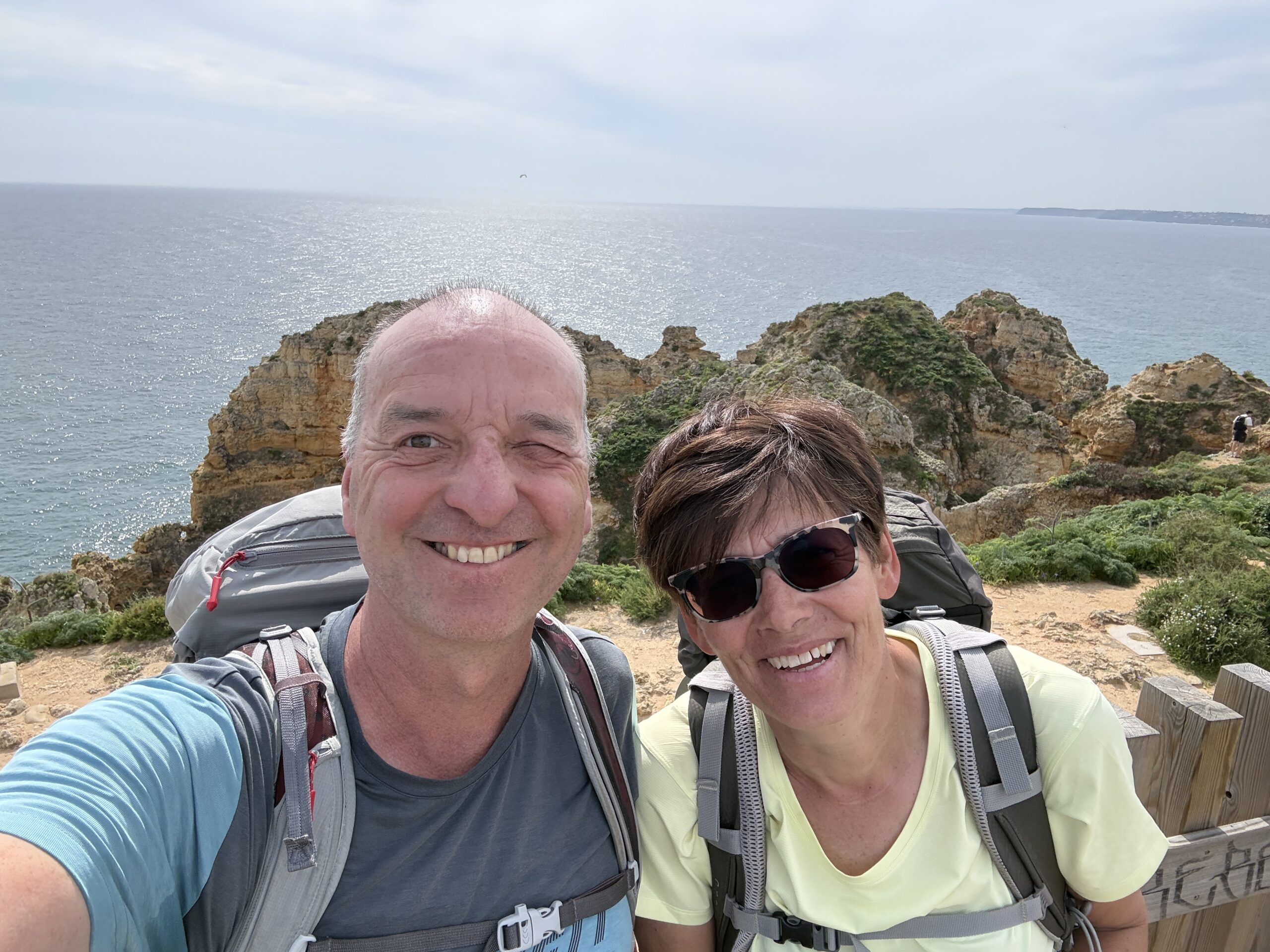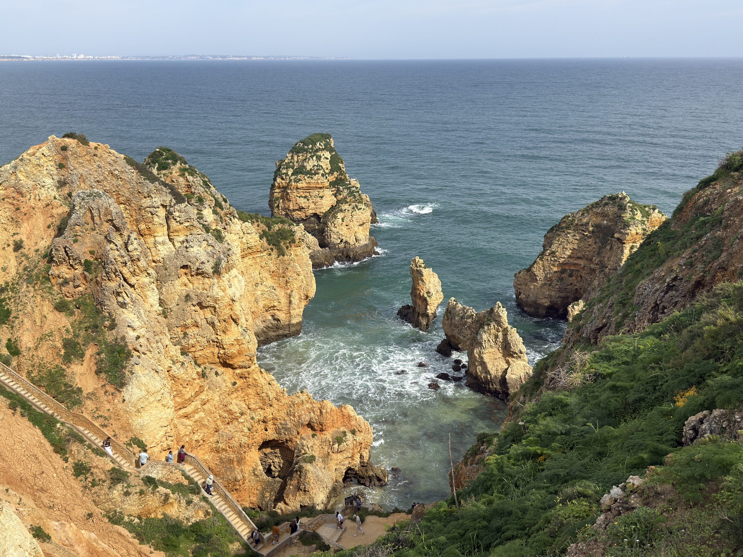 Der Weg schlängelt sich bis zur Spitze der Landzunge von Lagos, wo wieder ein Leuchtturm steht. Die letzten Kilometer führen uns durch ein parkähnliches Gelände, mit verschlungenen Pfaden, und vielen Spaziergängern, die sich die malerisch, zerklüfteten Klippen anschauen wollen.