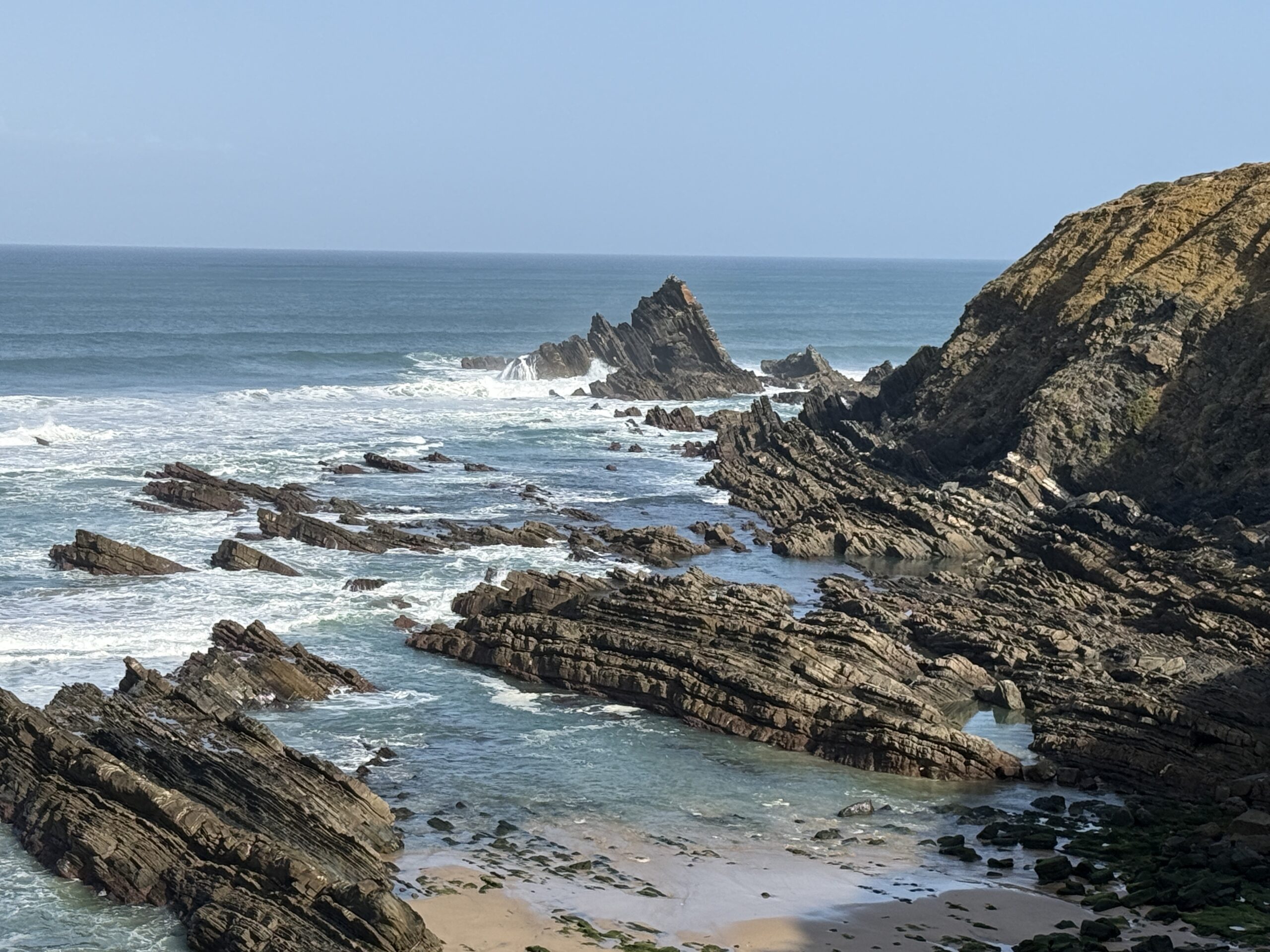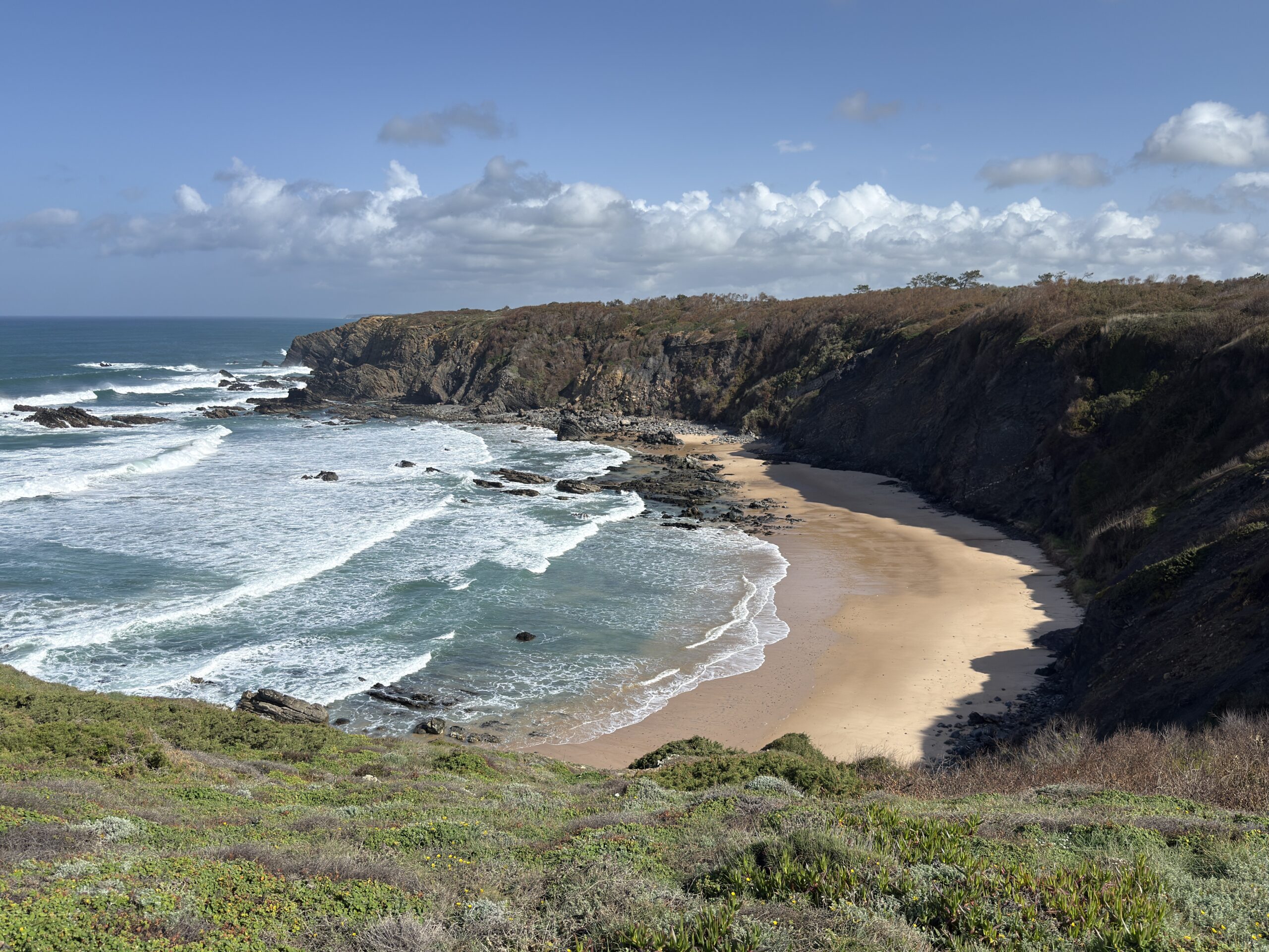 Nach 4 Stunden Wandern sehen wir bereits unser Tagesziel: Praia Odeceixe. Zwischen uns und dem Hotel liegen nur 100m, doch auch ein 20m breiter, tiefer Fluß. Die nächste Brücke ist in Odeceixe, 4km entfernt, so dass wir also noch ca. 7km Wanderung vor uns haben. Irgendwie frustrierend, zumal die restliche Strecke nicht so aussichtsreich ist, wie der bisherige Tag.